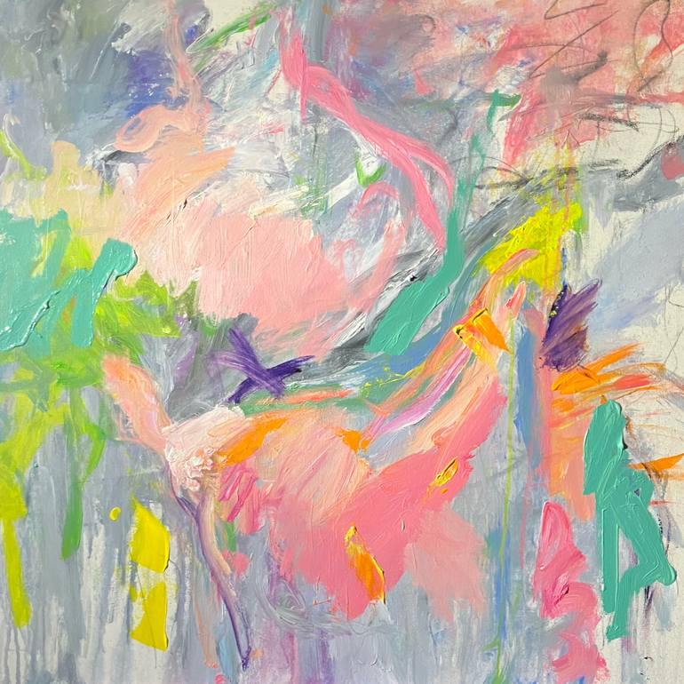 I began this piece chasing the tension between softness and urgency—the way spring light feels both gentle and insistent. As I worked, pinks and corals emerged like breath against the cool gray, while those electric yellows refused to stay quiet. I found myself drawn to the drips, the way paint surr...
