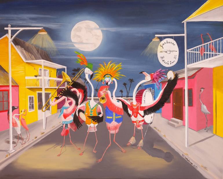 This piece depicts the fictitious and yet world-famous Nassau Bahamas flamingo band “The Conchers” living it up at the Junkanoo Beach. I was excited by the celebratory atmosphere of the event and took inspiration from the styles that I saw while doing my research for the piece. I wanted to take thi...