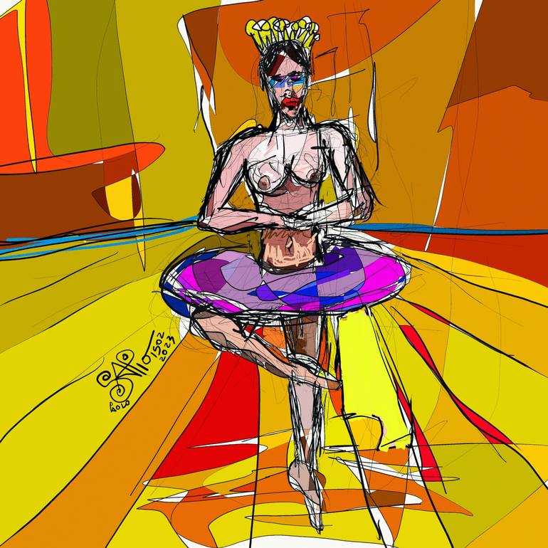 The Dance of Color: A Classical Ballerina in Warm Splatters" is a stunning digital artwork that captures the essence of a classical ballerina's passion and energy. The central figure is a nude ballerina, symmetrically composed with a purple tutu in the center of the painting. The warm splatters of y...