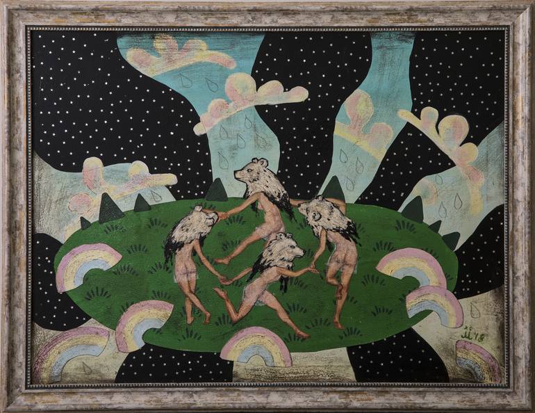 Four maidens wearing tar-tipped heads of rare white bears in exctatic dance between the day and the night. There is joy, horror and pastel rainbows.