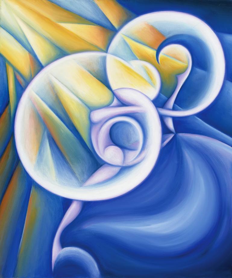 This painting speaks to empowering a personal journey of spiritual discovery and growth. The cubist yellow sun rays beam intense light down through the complementary contrast of a deeply spacious blue. As a joyful dancer leaps through the air towards the sun, the peaceful energy she emits radiates...