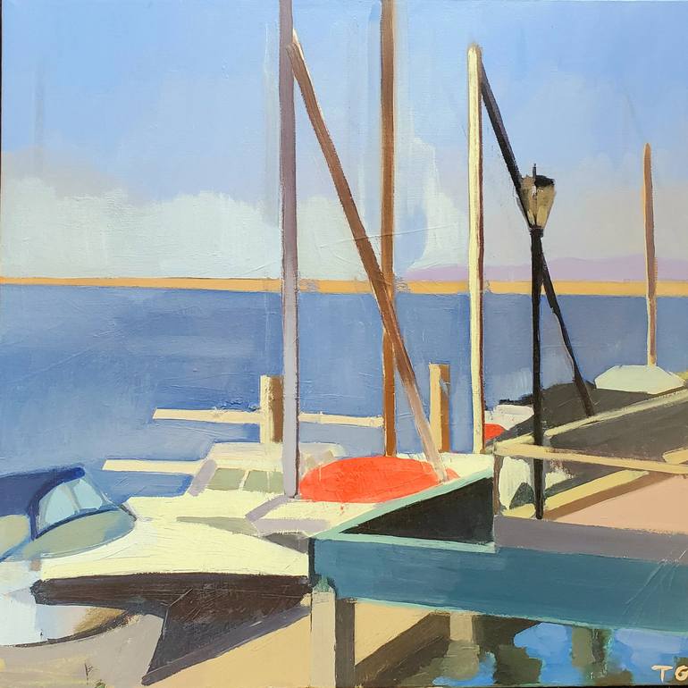 This painting was done on sight at the embarcadero in Morro Bay, California. The painting depicts a series of boats lined up at a dock on a sunny day. The painting explores the many vertical and horizontal lines and repetition of colors. Painting this was difficult, as the light is ever changing....
