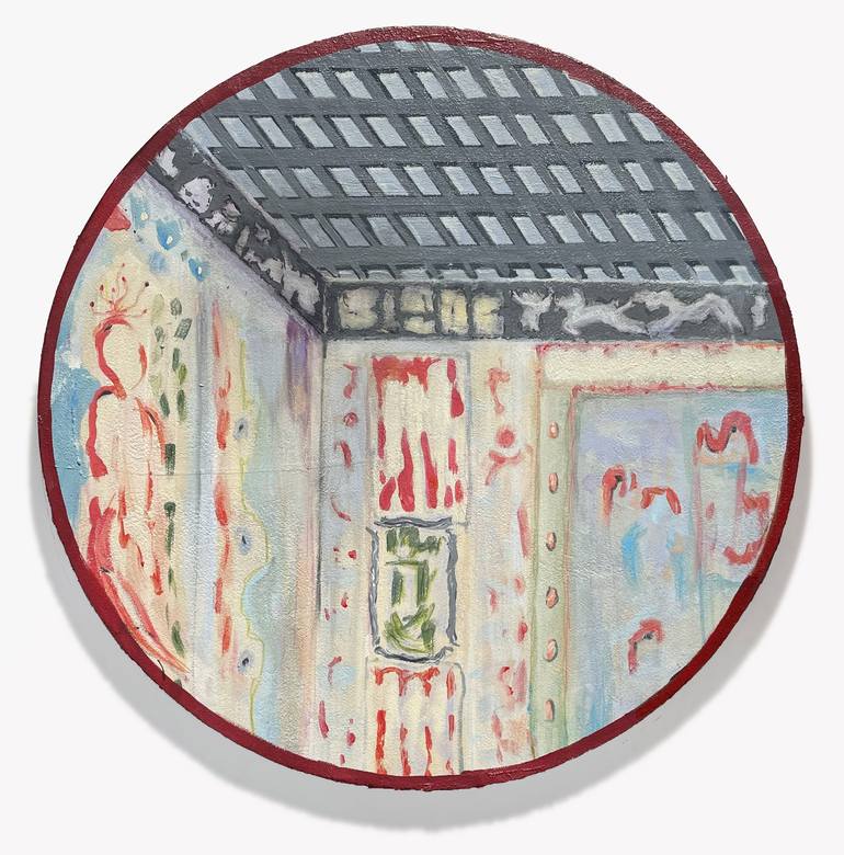 A round painting, also called a tondo. A loose interpretation of a interior with artwork hung on the walls and a architectural ceiling. Done with a light impasto that shows the texture of the canvas. The work was done with the highest quality archival paint over stretched canvas. Can be hung...