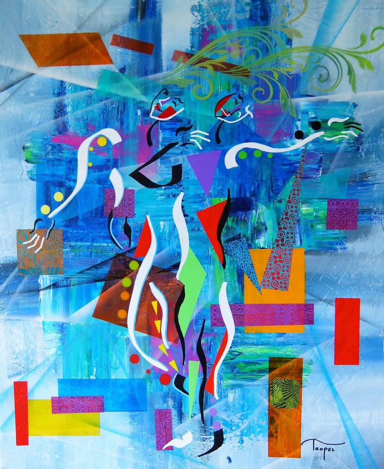 My approach focuses on body language and expression Touched by calligraphy I like to work on movement, gestures and lines. The deformation of the bodies makes it possible to release the essential. All my work is the illustration of my personal reflections on love, Life and Death but also on the hope that animates human beings and the relationships between them, while giving free rein to my imagination and creativity. I like to leave the audience with multiple possible interpretations I have not been in technical demonstration for a long time, but I orient my work towards suggestion. "I like playing on the delicate chord of emotions" "Painting can not be a simple coloring of a drawing" "I try not to weigh down the canvas with decor or accessories" "A esthetics are of little value to me, what I’m looking for is the strength or the power of a feeling" TROPEL mixes his emotions and his dreams to give life to unreal and improbable characters. "I love what movement does to the body. So I twist it, I attempt to bend it the way I want it and attempt to make the idea I want to give the spectator appear."