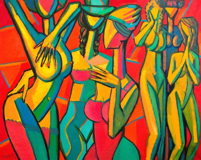 Stylised cubist composition presenting competition between the young and older girls teenagers. Original is painted on canvas with classic oil colors, finished with varnish. Technique used is classic oil paint with brush and spatula