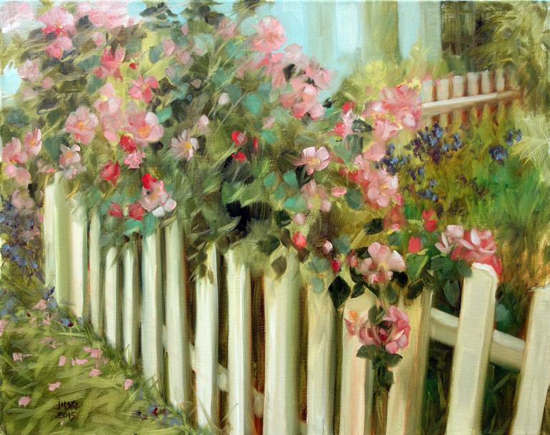 An impressionistic and nostalgic image of roses growing along a picket fence.