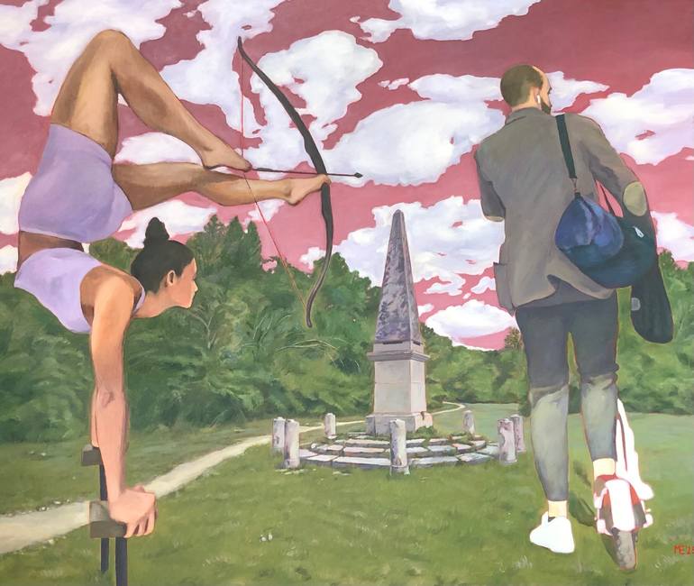 The escape is an attempt to bring into today's context a mythological story narrated by Ovid in the Metamorphoses, here contrary to the myth, it is Apollo who is chased away by a Daphne who becomes Diana with bow and arrows.
