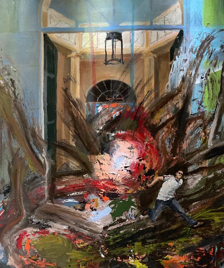 This painting captures a moment of raw chaos and impending doom. A grand hallway, once regal with its towering arched entrance and delicate chandelier, is now the epicenter of destruction. Jagged roots or tendrils burst through the space, twisted and violent, dragging with them a wave of debris, ear...