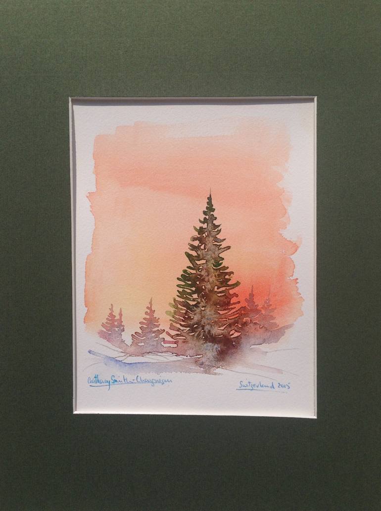 Watercolour on paper of a Swiss Mountain pine valley at sunset with passpartout