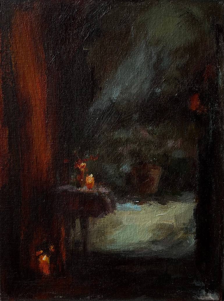 The painting " The Evening" was painted in 2019 in the technique of acrylic painting as part of an urban series of small-format landscapes. The painting depicts a fragment of the interior with burning candles, the beginning of twilight. The work was created on the contrasts of warm and cold and the ...
