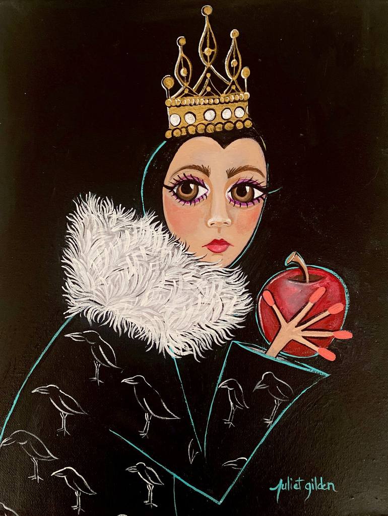 An acrylic portrait of the Evil Queen from Snow White. She is holding the poison apple with a pattern of a bird on her robe and a crown on her head.