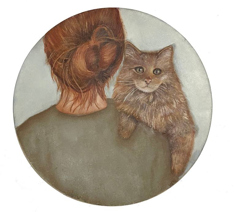 I'm inspired by the relationship between people and their pets. In this series the people are facing away while the pet directly looks at the viewer. Depicting the woman from the back allowed me to focus on her hair. This is an oil on a circular 16" canvas. The back is wired and ready to hang.