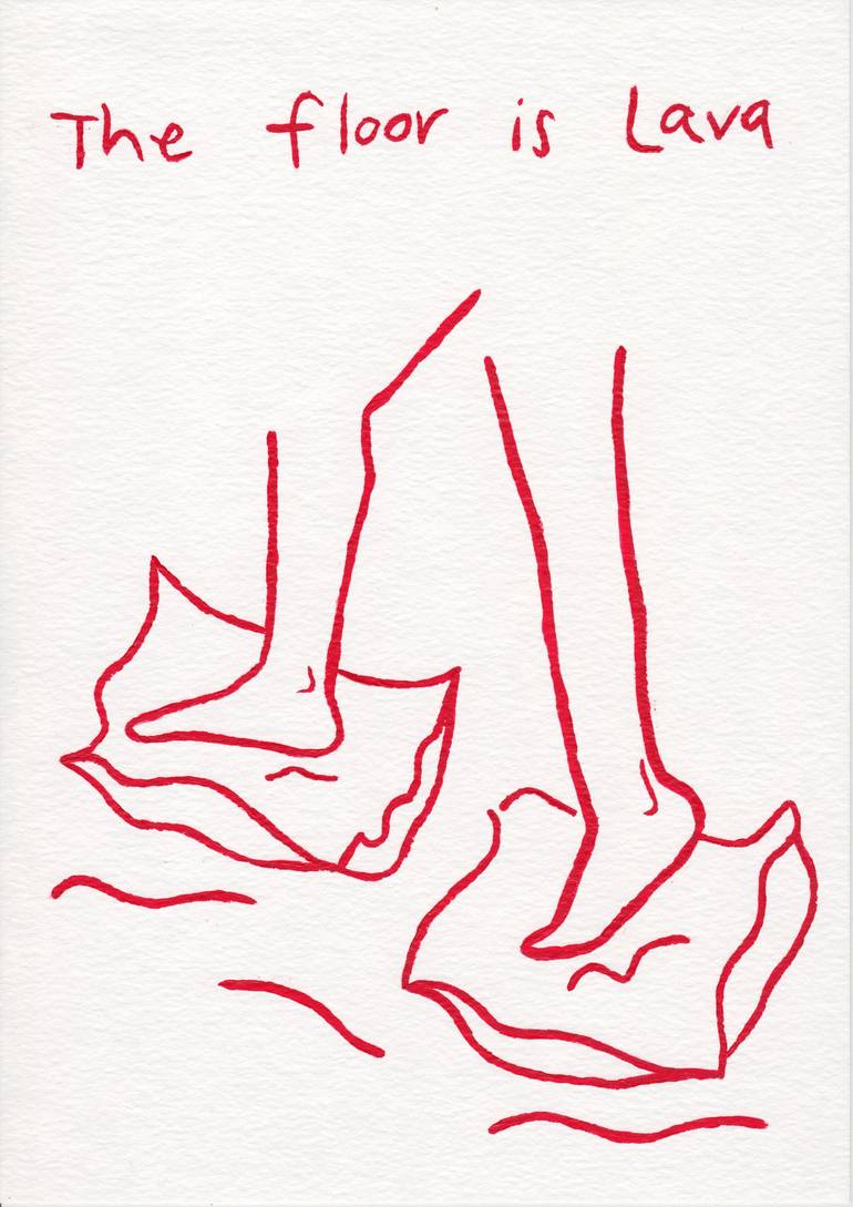 This work was inspired by a game of 'floor is lava' I was playing with my nephew. I hope it makes viewers feel nostalgic and playful. The bold colour and simplified use of line aim to translate this feeling.