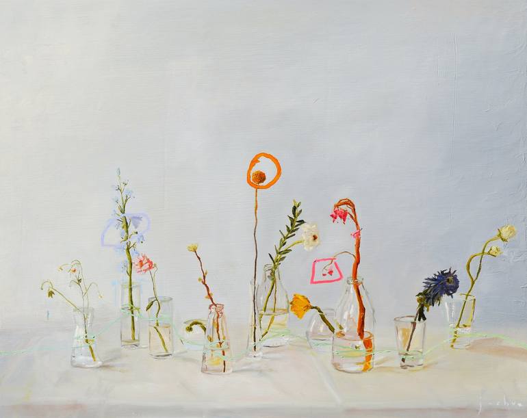 The Flowers I Stole / Oil on Wood panel / 76 x 61 cm Part of my "Conversations Over Flowers" Series. The series focuses on romantic, honest settings of flowers. They have a contemporary twist with my modern mark marking throughout the pieces such as flat colour shapes highlighting and complimenti...