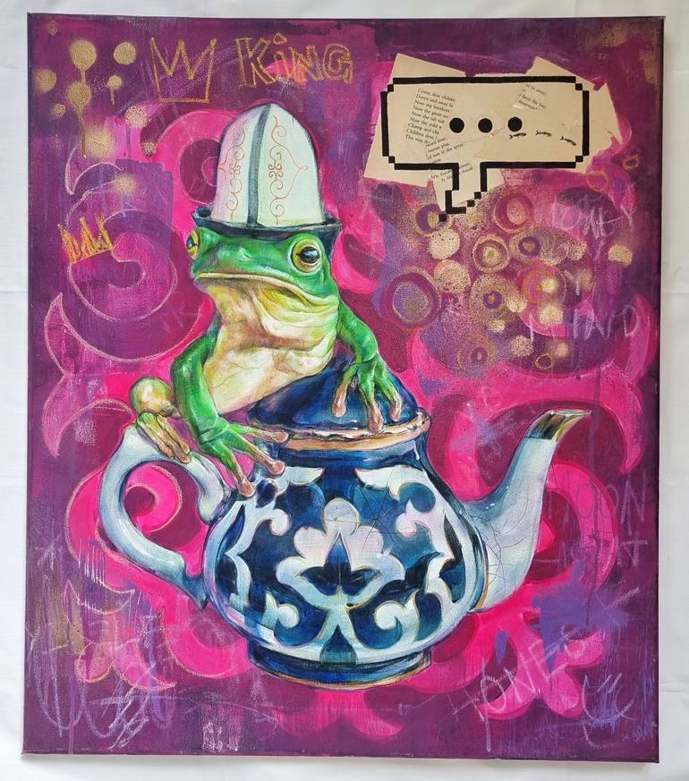 This 60x70 cm acrylic on canvas unveils a vivid scene: a green tree frog, crowned with a felt hat, perches regally atop a gilded Central Asian teapot, its ceramic surface fractured with cracks spidering outward. To the frog’s right, a pixelated speech bubble with three dots hints at an unspoken thou...