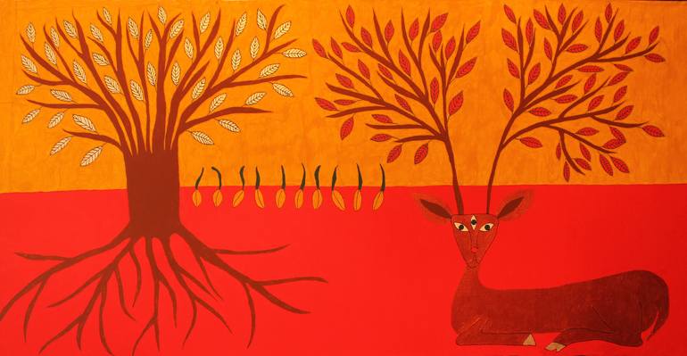 The Garden 147х75, acrylic on canvas 2014 The deer symbolizes the creature, which submerges deep inside, into the ground, to wait and gain strength. The third eye of the deer – the symbol of awareness. The red color of the ground is the blood – the life-giving power, primary energy of life, fertile...