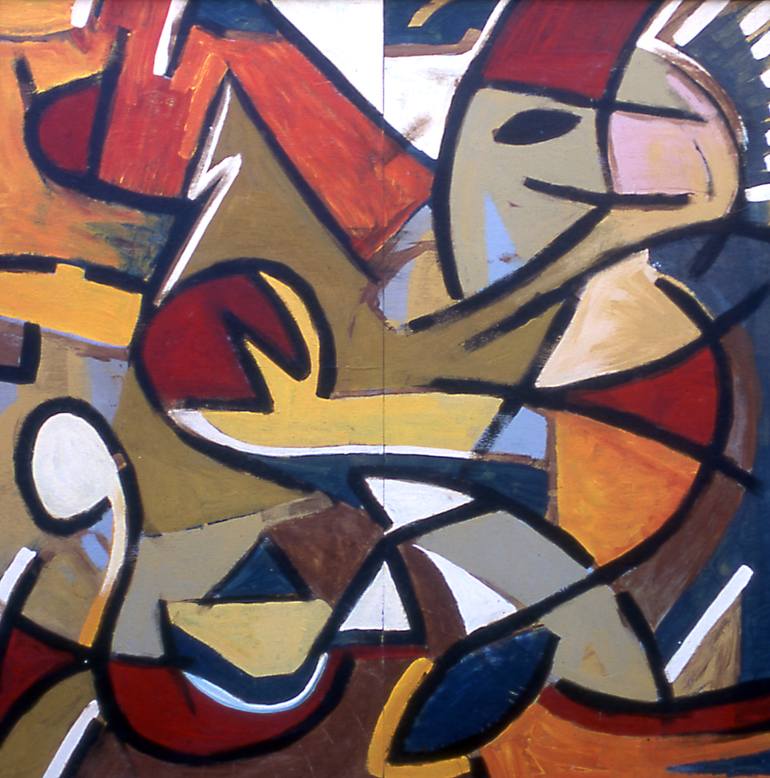 This is an original painting using mixed media on two lauan panels which have been framed and finished with poplar. The piece is very lightweight and makes a strong statement. The imagery is derivative of Egyptian hieroglyphics and esoteric quasi-religious knowledge in conjunction with modern day co...