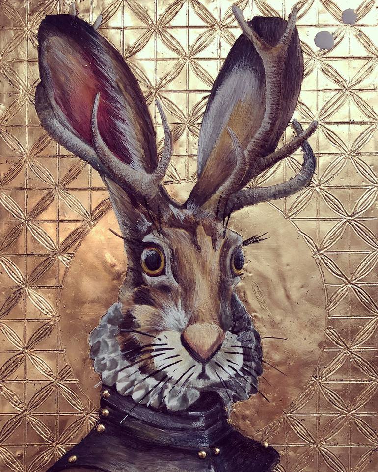 Encaustic Antlered portrait of a whimsical Armored hare on a gold leaf relief background.