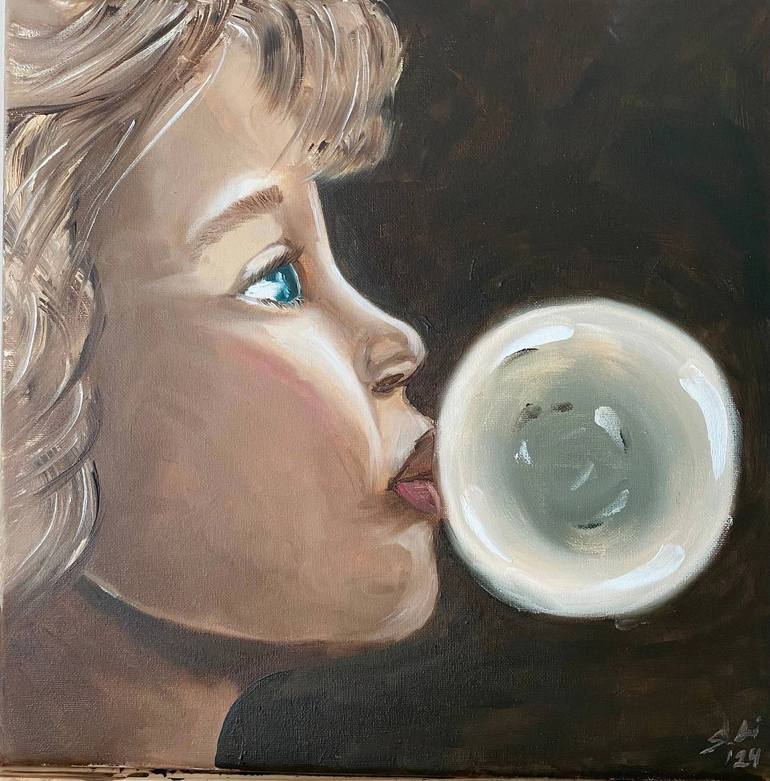 This 40x40 cm oil painting, crafted in a style combining realism and impressionism, depicts a young girl in profile blowing a white bubble from gum. Her light hair and striking blue eyes captivate the viewer, while her gaze into the distance evokes thoughts of inner worlds and infinity. The dark bac...