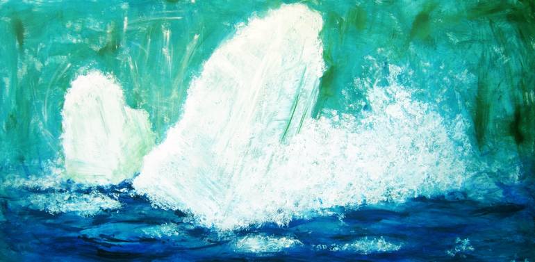 A seascape view of a melting of a glacier, with the colors of the sea and ice, in different shades of blues greens. Original piece is a painting on a large format canvas.