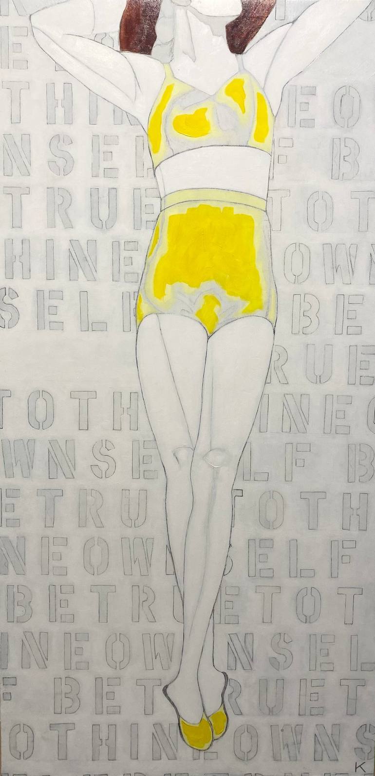 Behind the figure are the words "To Thine Own Self Be True", a line from act 1 scene 3 of Shakespeare’s play, Hamlet. It is spoken by King Claudius’ chief minister, Polonius as part of a speech where he is giving his son, Laertes, his blessing and advice on how to behave whilst at university. Wome...