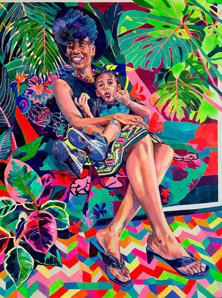 In The Good Days, the artist portrays a tender, everyday moment between Leilah, a young Black mother, and her son. She sits confidently at the heart of the scene, her gaze turned warmly toward someone just outside the frame. Her son, relaxed and content, looks directly at us with a quiet curiosity a...