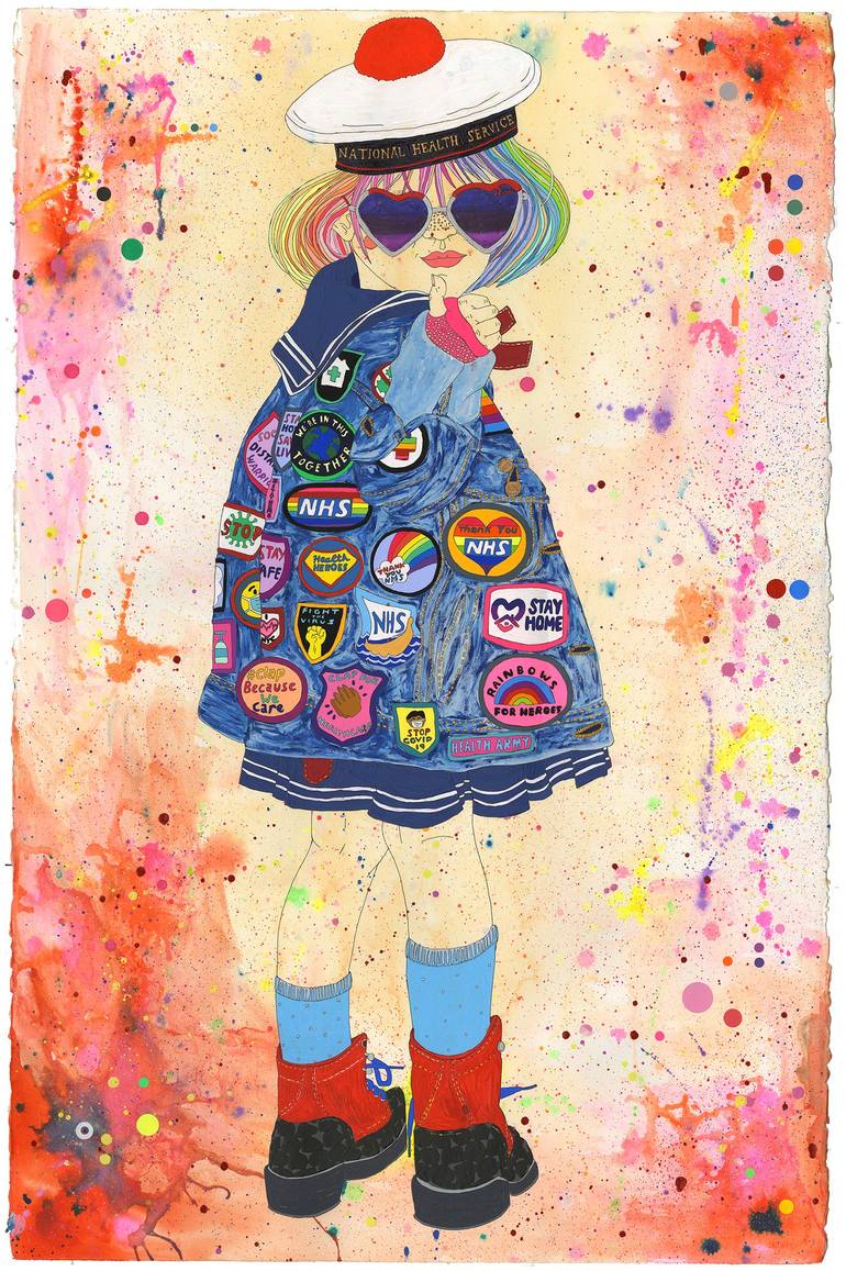 From a series of art created in lockdown, exploring self portraits in the image of my nephew and nieces. My niece Millys dressed as myself styled as a sailor, with a nod to the hospital ships of the pandemic and a salute to the NHS. Mixed media on cotton rag.