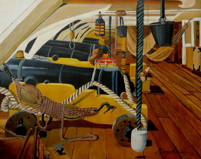 HMS Victory, flagship of the British fleet at the Battle of Trafalgar. This is her lower gun deck. This piece has been painted on archival quality canvas paper and has been given a protective coat of clear varnish. It is 16X20 inches or 40X50 centimeters.