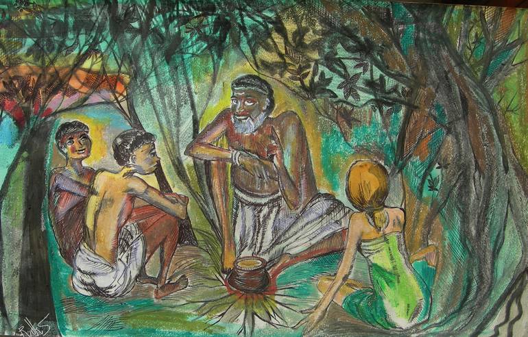 The Gurukul, An Acrylic and charcoal painting on paper in size 11" by 19" inches only. This is Titled Gurukul as the earlier ancient schools in India called The Gurukul. Children were sent to their Gurukul's to study Moral Science, Archery, Mannerisms, under Strick Discipline with the guidance of th...