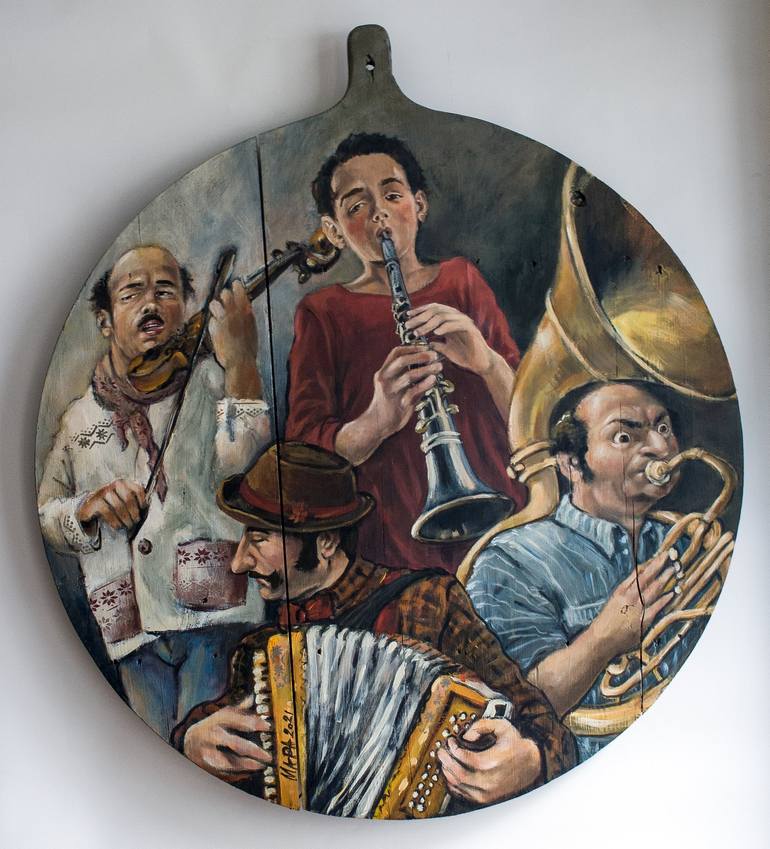 The painting is made on the board of an old rural wooden masita, manufactured of beech. A few musicians are seen, playing on their instruments and singing. It has vivid and bright colors. This wooden board, painted with acrylic, is part of a conceptual exhibition, named THE WEDDING. The whole group ...