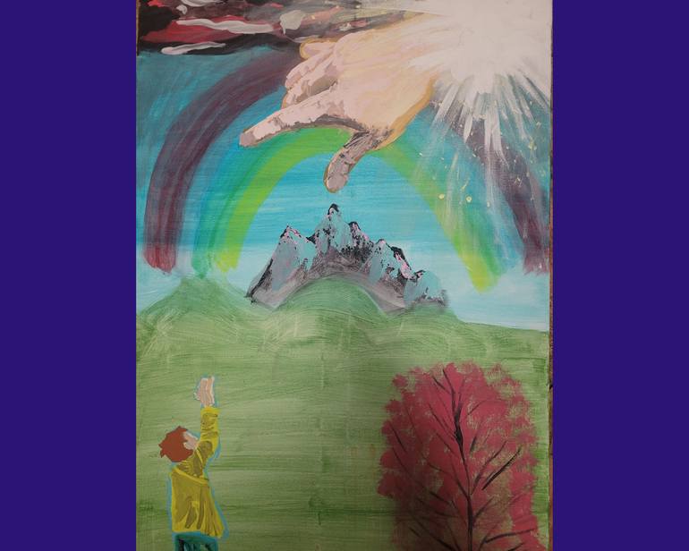This is a picture in the lands of Canada, where God is shown as coming from above with the light, and extending his hand down, to the child with disabilities. His light is shining, he is all powerful. The armageddon is soon, and gods covenants with a rainbow are shown. I painted this image using pic...