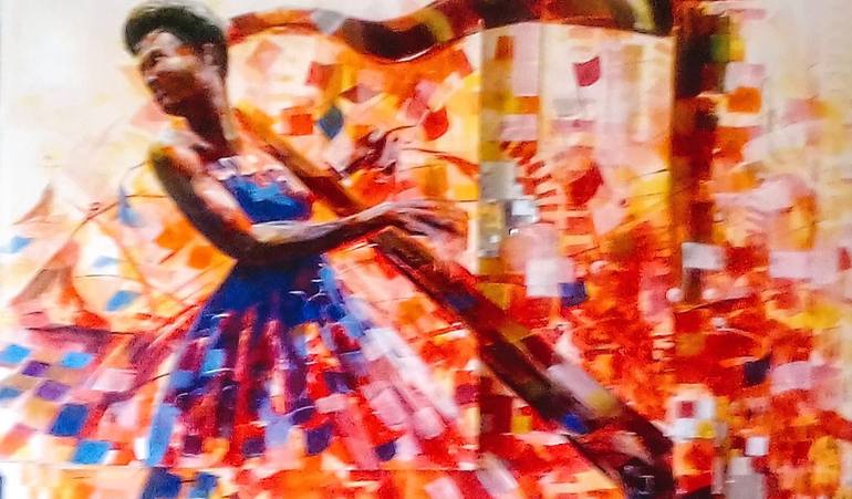 Mbongeni's work is inspired by music and dance, he captures motion, mood and the rhythm to engage the viewer into the beauty of his musical work. He considers his artwork as visual music and expresses his feelings musically on piece of canvas singing his songs with a paintbrush. The body of his work is largely figures, evolving from abstract images to recognisable elements using vibrant colours, texture and 3D effects.