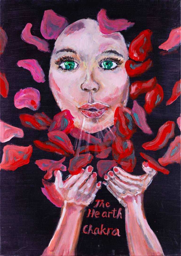 I tried to picture our heart chakra in symbolic expression of a woman giving us her love from her heart, decorated with flower petals of pink - red color subtoned by her shining green eyes.
