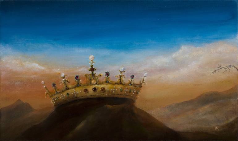 This painting is a suggestion to create a narration. Why is this crown here in the mountains, who was its owner? It looks like a barbarian one, but it doesn't have an exact prototype... Thus, we can ask a lot of questions and make different guesses. But the truth is that we will never get the real ...
