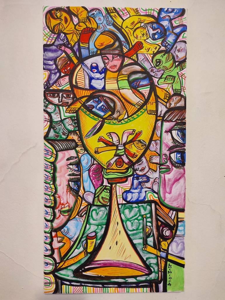 "Dimişcă is in a relation of dependence with the new figuration, as Robert Combas, Dirosa.. Dimişcă has got everything to be the leader of this Free Figuration. His work is between Raw Art and Contemporary Art. He has boldness in brush, in color. He has spontaneity in ideas, in the narrated happenings. He is a narrative painter. His inspirational source is the great culture where from he extracts: mythologies reviewed and improved by himself, folk-tales from his childhood, from his homeland. He paints with a warlike passion, with exaltation, with a great deal of physical engagement. However, Dimişcă doesn’t make war but love through his colors. He can pass from icon to the erotic painting. Both will be full of tenderness and love. Look in the eyes of his characters…they love you! Dimişcă loves you too, as much as he loves Art and Freedom. He helps us to travel back in time, his imagination strikes you, overflows, fills you, hits you with the colors of his characters, from the past, yet so present. What if nothing would be changed, what if everything would stay still…what if everything would be alike…what if there would be no difference…? Dimişcă asks and asking questions means to believe in future. His work is full of that optimism, which is indispensable for the development of the art. Is he a painter? Philosopher? Both, carry him undoubtly to the peak of the art. As all the artists of the world, he is a defender of the freedom of creation. Realism and Utopia lead his hand, he hurries, paints fast, there are many things to be done and the life is so short. He is possessed by grace, it seems that he does everything effortlessly, his easiness, his skill surprises you when you get lucky and have the chance to watch him painting-which is very rare. His bashfulness and shyness makes him more comfortable in the solitude of his workshop than in public. I can write page after page about Dimişcă and his work…, so much did he surprise me, astonish me…he was like a thunder strike. I am sure that Dimişcă will amaze us again. P.S.: If you will visit France come to see the mural painting made by Dimişcă on the wall of my museum from Lapallise, in Allier, in the middle of France. It happened in a spring day, with a golden sun, golden as his yellow colors.