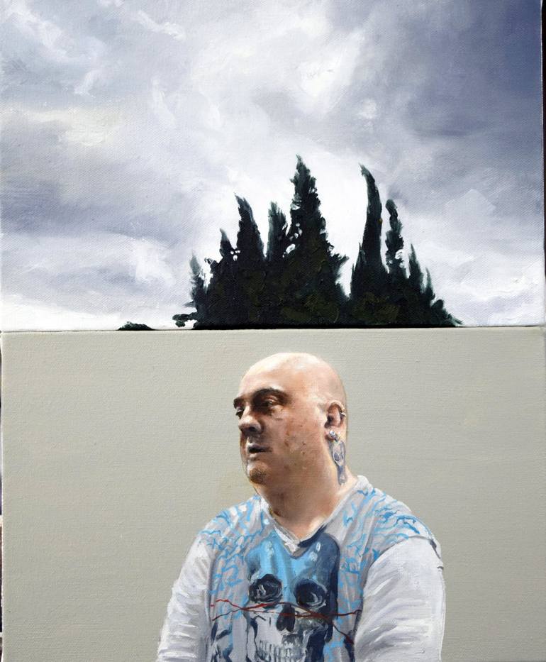 This is one os a series of paintings which cross the rural location of my studio with the city landscape of my home in London. The wall divides the two and is also a prison for those who stand this side of it.