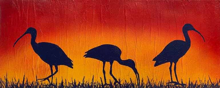 The Ibis Trio is a textural, abstract painting. Using a base layer of paper applied to the canvas creates a unique texture to paint on. Followed by blending layers of spray paint. With the final application of the deep purple acrylic silhouettes in acrylic. The texture and color wrap around the sid...
