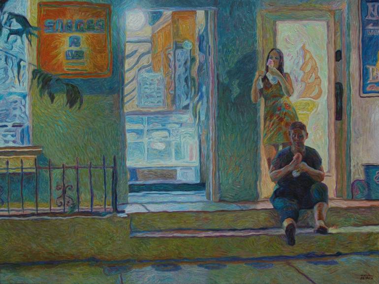 Walking in the street at night, I was fascinated by this scene, two people eating ice cream, outside the shop, in the electric lighting, giving the colors an unreal tone on the facades, the same colors more acidic and fresh than those of ice cream! And giving the shadows blue and cold tones.