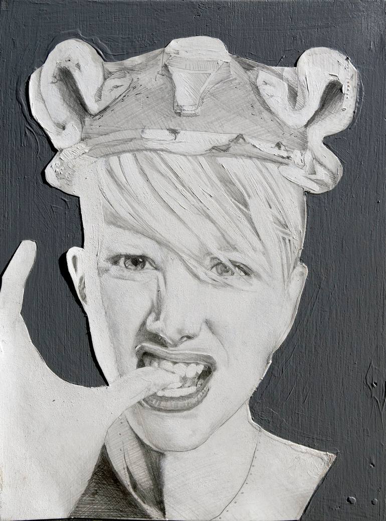 When painting, headdresses and crowns deify Kate Kelton’s subjects. She uplifts the Unsung Sheroes & Heroes, Patriarchy Smashers, Warrior Survivors, Silence Breakers, Philosophers, Truth-Tellers, Whistle Blowers and Thought Giants of all stripes. She paints her portraits cloaked in the garb of statues Ladislav Šaloun sculpted onto the train station that her great-grandfather, Josef Fanta, designed for Prague in 1901 - 1909. Apotheosis through a reclaimed, reapplied Art Nouveau. Sampling her own lineage, she transforms a historical body of work, itself a thing of lasting beauty; exchanging granite for graphite, plaster for paint. In Photoshop, she first combines the desaturated faces she's found, sourced or shot of her chosen subjects, with the black and white photos from her family and friends, of the statues in situ. Then she uses graphite, inks and acrylic paints and glazes to create the works on panel or canvas, literally uplifting and elevating her battle-weary subjects to the highest reach of architectural strata. 'Ancient and distant godlike beings, surveying a dying empire, trade places with the fresh blood of her subjects. The work presents a tactility against the digitized space, and represents a taking, an acquisition of power back from the tastemakers. Here, the mantle of the artist is above brand influencer, above internet commentator, above mere marketability. In their gaze is a warning, “Art is immortal. Come for me, why don’t you?”' ~ Micah Chaim Thomas "Kate's recent work is a matter of expansion through contrast - she is as ephemeral as her subjects are concrete architecture; she is structural when her subjects should slip through your fingers like too-fine sand. Taken as a whole, the works in her magnificent series Sentry are incredibly intelligent, but when looked at individually, you come to understand that these are statements of life beyond themselves. The series take embellishments of a Prague train station designed by her great-grandfather, Josef Fanta, and combines these with portraits of women who have stood against the sexual harassment and assault rampant in Hollywood. These women, like Kate herself, have suffered in the era where powerful men, every bit as immovable as the train station, wielded their power without check. The portraits emblazoned on architectural elements, they are marked against the edifice, every bit as permanent, and perhaps even more defining.
