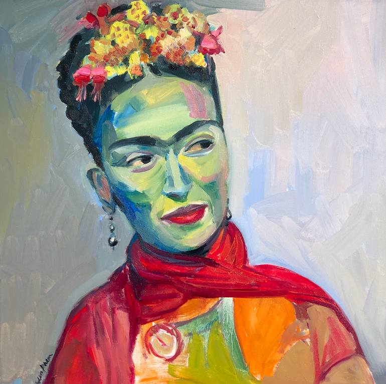 READY to hang. Textured finish and bright, warm and strong contrasting colors. I often turn to Frida for inspiration when I feel like skipping work or have a hard time concentrating. In the hundreds of online photos of her, I can always find one that stands out that is good for any mood