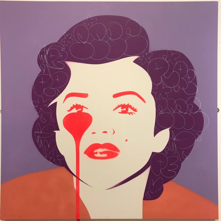 76 x 76 cm x 2cm Stencil spray paint on canvas 2015 Unique colourway Exhibited at the ‘Echoes’ show at Wunderkammern Gallery Rome Pure Evil explains that a chance email from a Chinese “copy village” gave impetus to his “Nightmare Series.” The village offered, via email, a list of artists it could re...