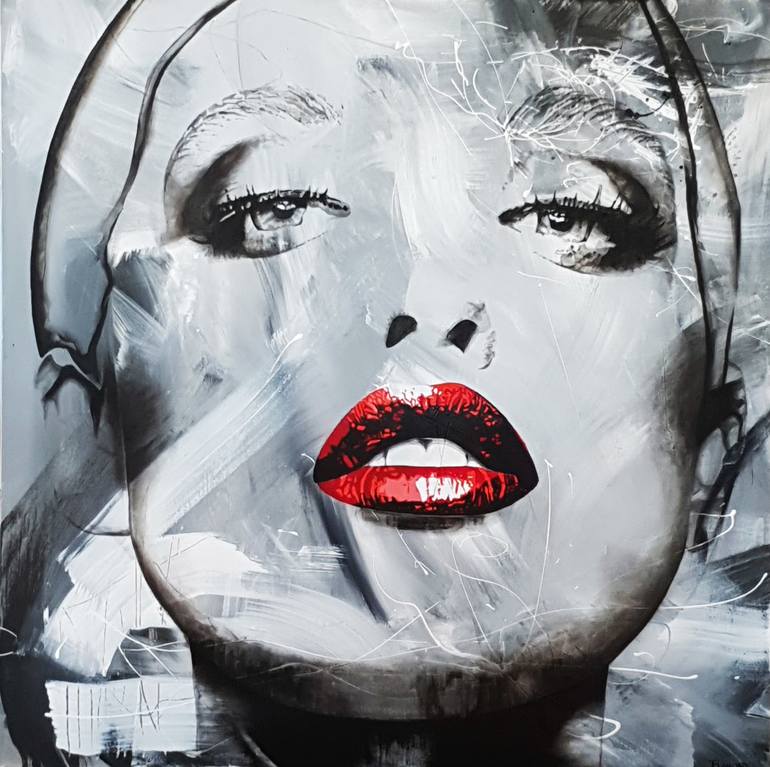 Acrylic and Ink on a gallery wrapped canvas measuring 101.6 x 101.6 x 3.5 cm. Sides are painted black. This painting is a new take of my original painting 'Seduction'. Larger in scale, the hand painted face fuses with the abstract black and white background. The red lips add a striking pop of colour...