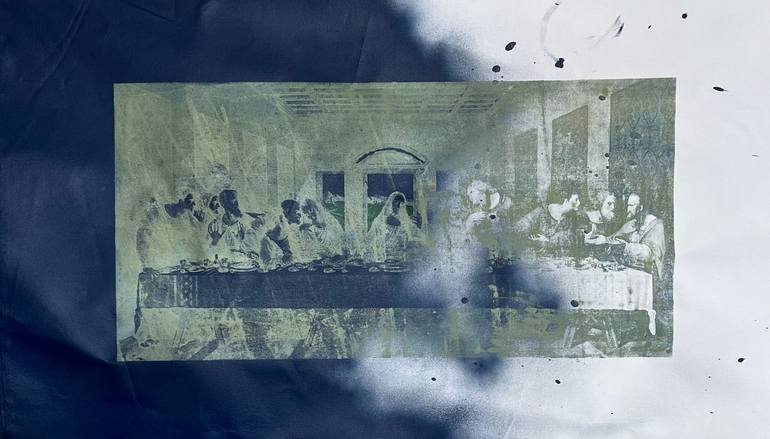 Printed in a manner similar to Andy Warhol. Acrylics on canvas. The spray paint is navy in color and is made specifically for artists.