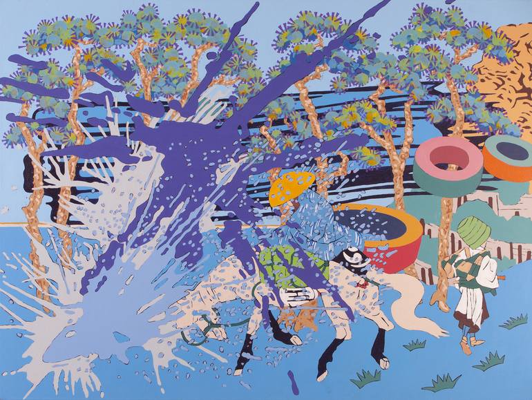 A figure rides through an American Japanese landscape unaware of the paint explosion that he is heading for.