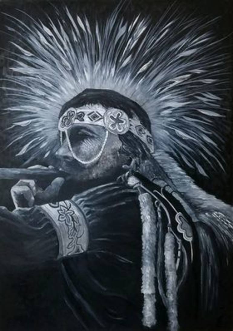 A Native American playing a flute while dawning an ornate head dress