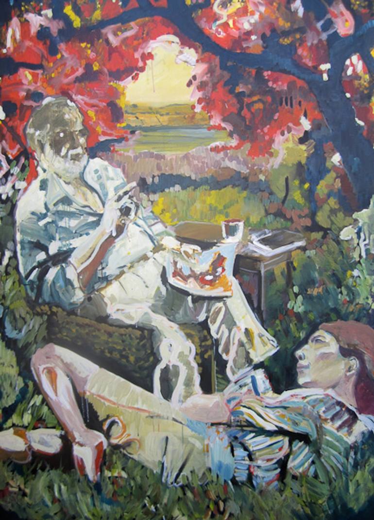 74" x 48" Painting inspired by John Fowles The Ebony Tower, source image photograph of Francis and Sophia Coppola .