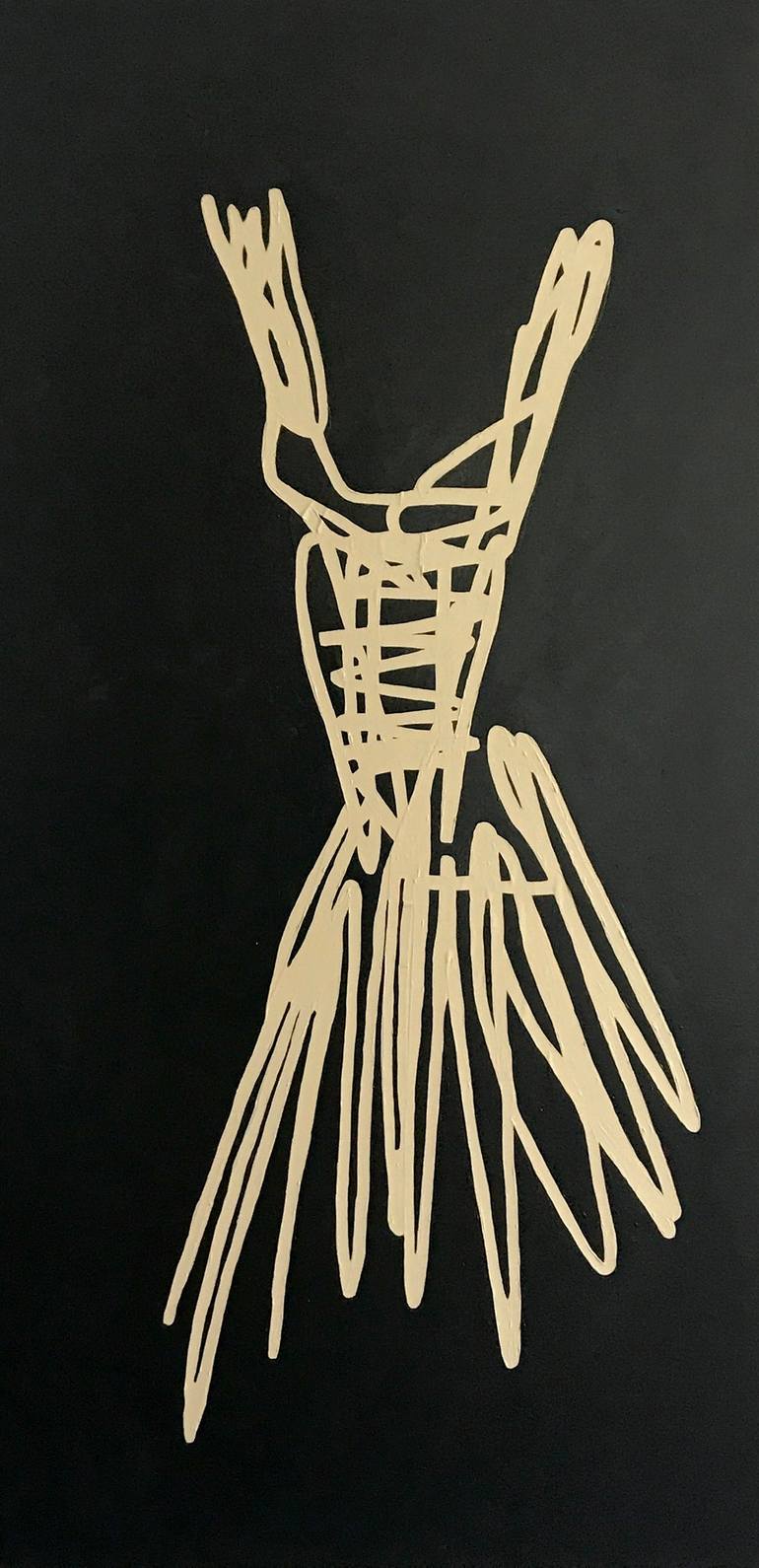 Illustrative in nature, this painting feels like a drawing yet is very much a statement piece of art. I love the movement of clothes on a body and I like to imagine the energy of movement thru exciting lines. Acrylic on canvas. The lines feel like something other than a piece of clothing but when yo...
