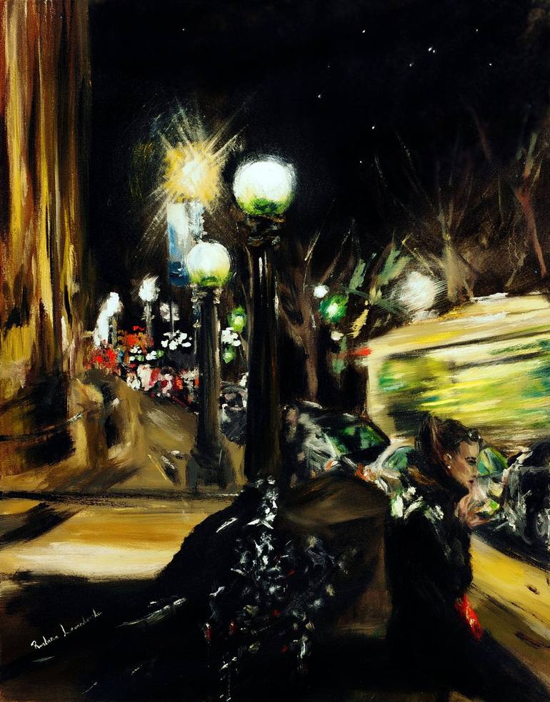 This original, one-of-a-kind painting captures a lively New York City evening just around the corner from Central Park. Parked cars line the street while others pass by, their headlights illuminating the night alongside glowing streetlamps. Amidst the motion, a young woman pauses to check her reflec...