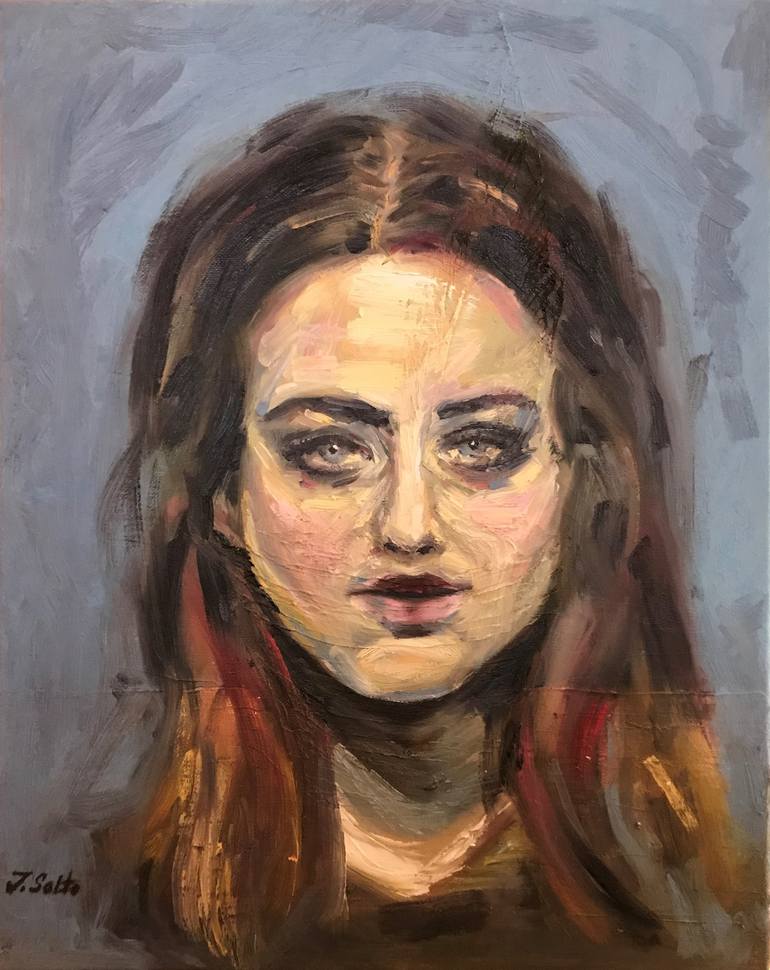 A portrait of a modern young woman on blue background, gazing intently into the viewer's eyes, and yet one can't shake off the feeling that she is looking beyond what's immediately in front of her. True to the concept of modern femininity, her features convey vulnerability along with strength, child...
