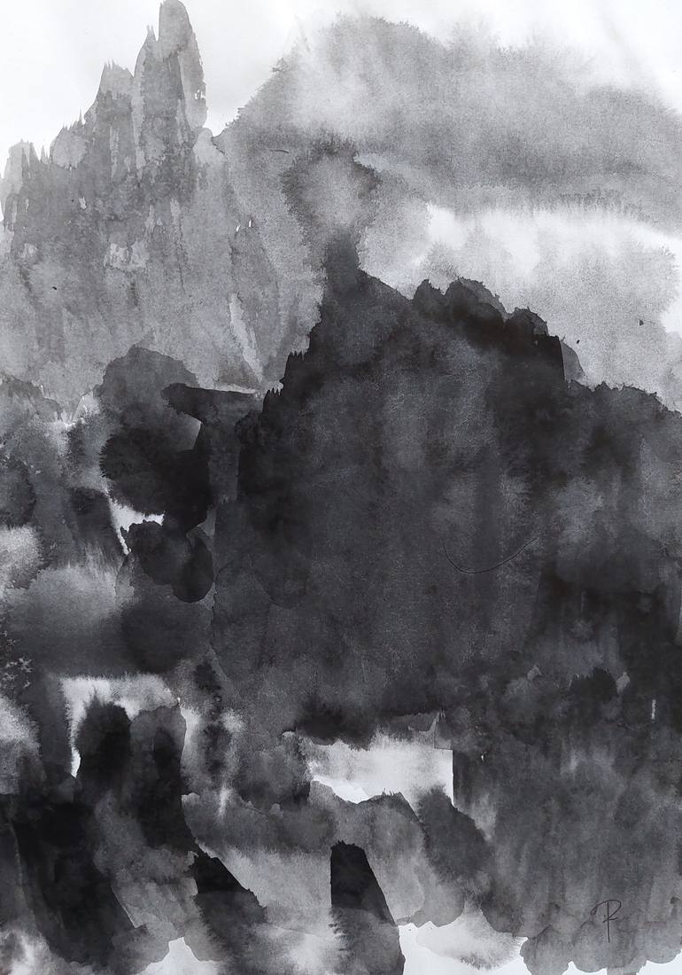 This piece is a Meili Mountain during the first appearance of light before sunrise, looked from inside my camping tent when I backpacked there in 2015. I tried to capture this atmosphere and mood of this mystical mountain.